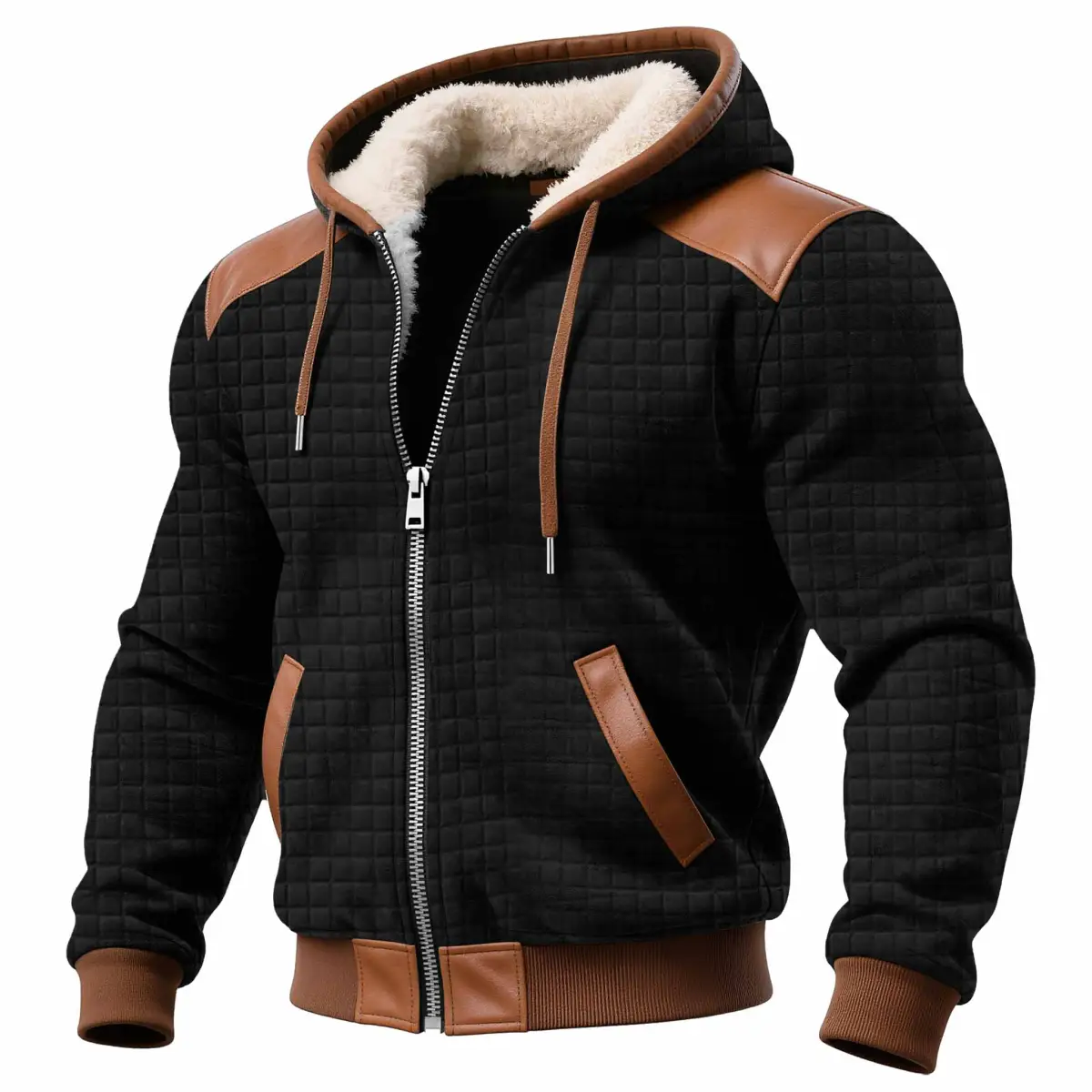 Men's Vintage Black Quilted Plaid Waffle Panel Leather Fleece Hoodie Jacket